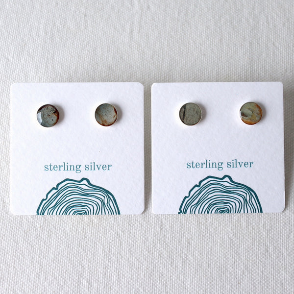 Natural, easy-wearing studs made with preserved fragments of birch bark. Crafted to show off the unique, graphic markings in this beautiful bark. Set into durable, hypoallergenic sterling silver cups and posts, which are very kind to sensitive skin and ears. A perfect way to take a little piece of nature along with you wherever you go.